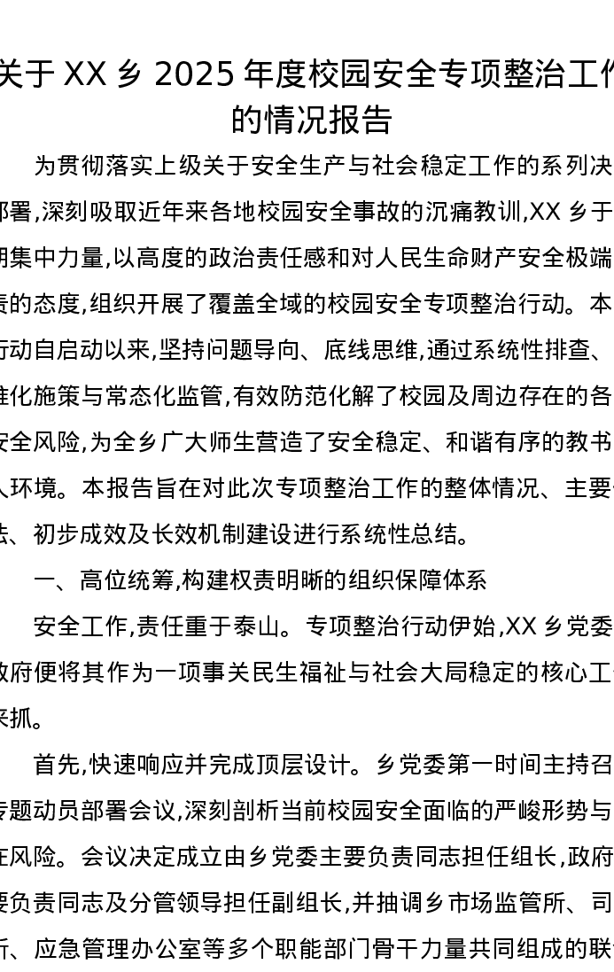 关于XX乡2025年度校园安全专项整治工作的情况报告