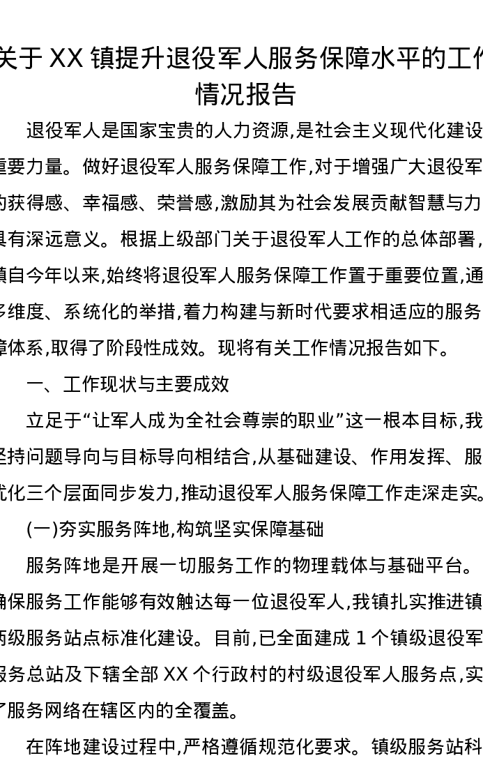 关于XX镇提升退役军人服务保障水平的工作情况报告