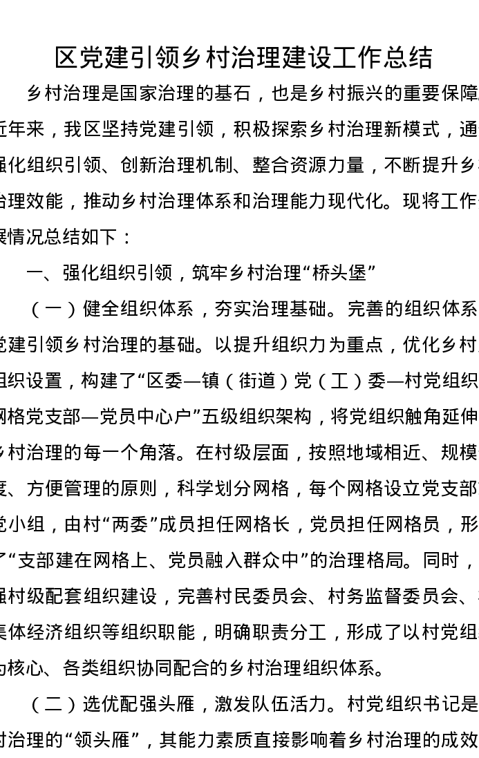区党建引领乡村治理建设工作总结