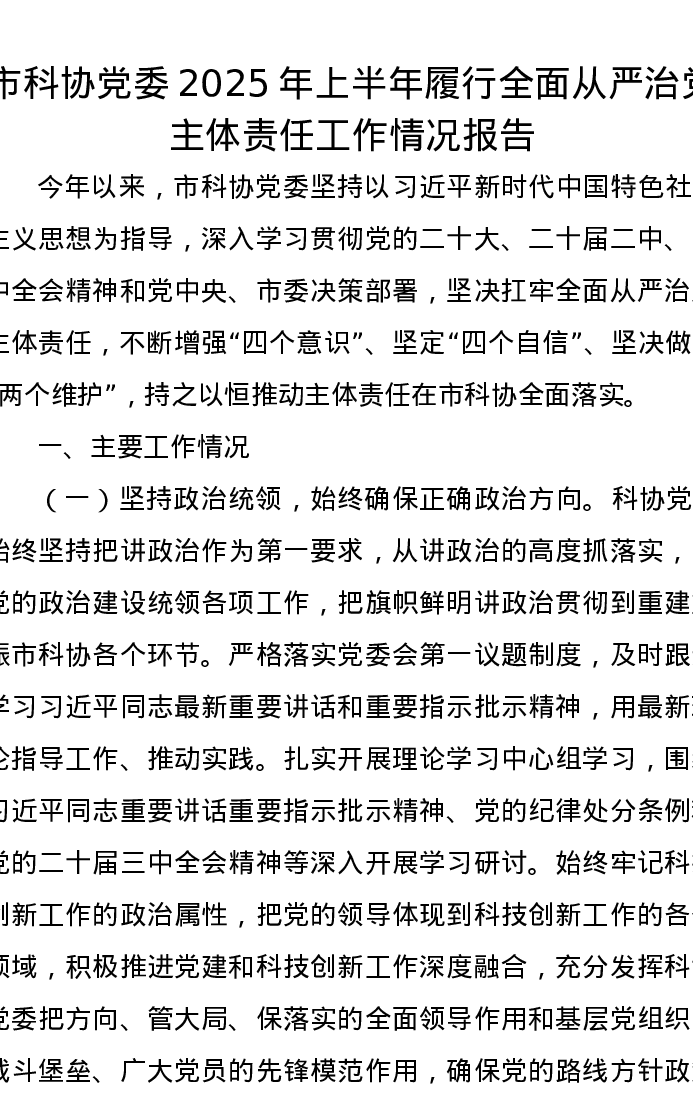 市科协党委2025年上半年履行全面从严治党主体责任工作情况报告
