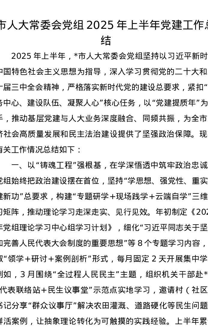 市人大常委会党组2025年上半年党建工作总结