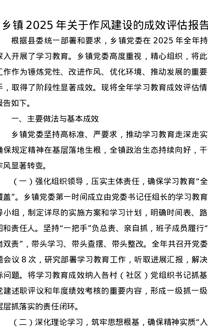 乡镇2025年关于作风建设的成效评估报告