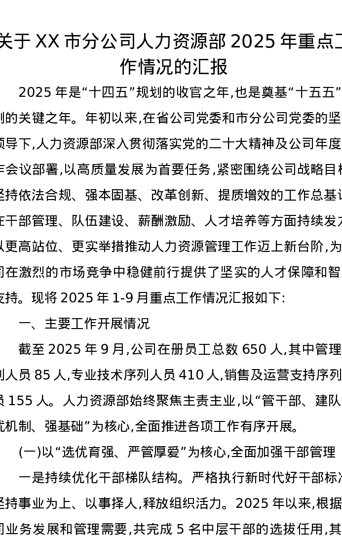 关于XX市分公司人力资源部2025年重点工作情况的汇报