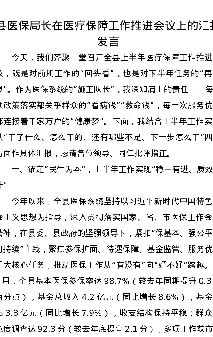 县医保局长在医疗保障工作推进会议上的汇报发言