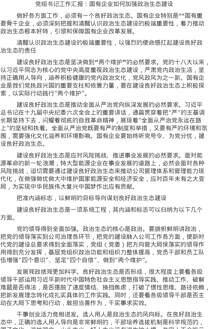 20220417党组书记工作汇报:国有企业如何加强政治生态建设