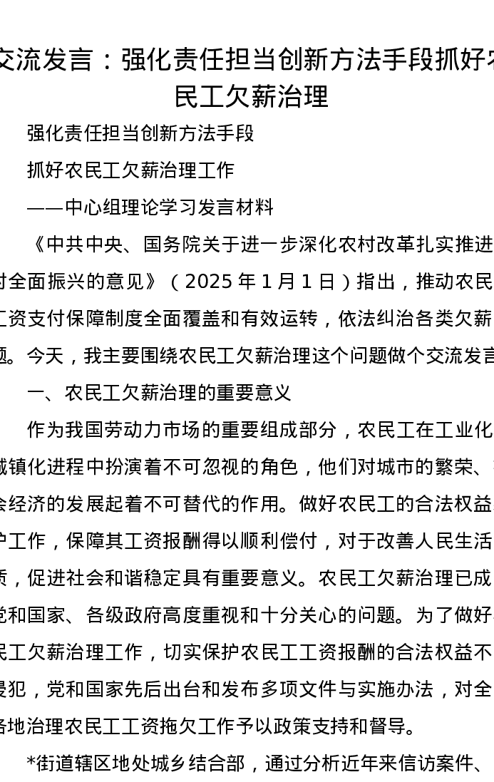 交流发言:强化责任担当 创新方法手段 抓好农民工欠薪治理