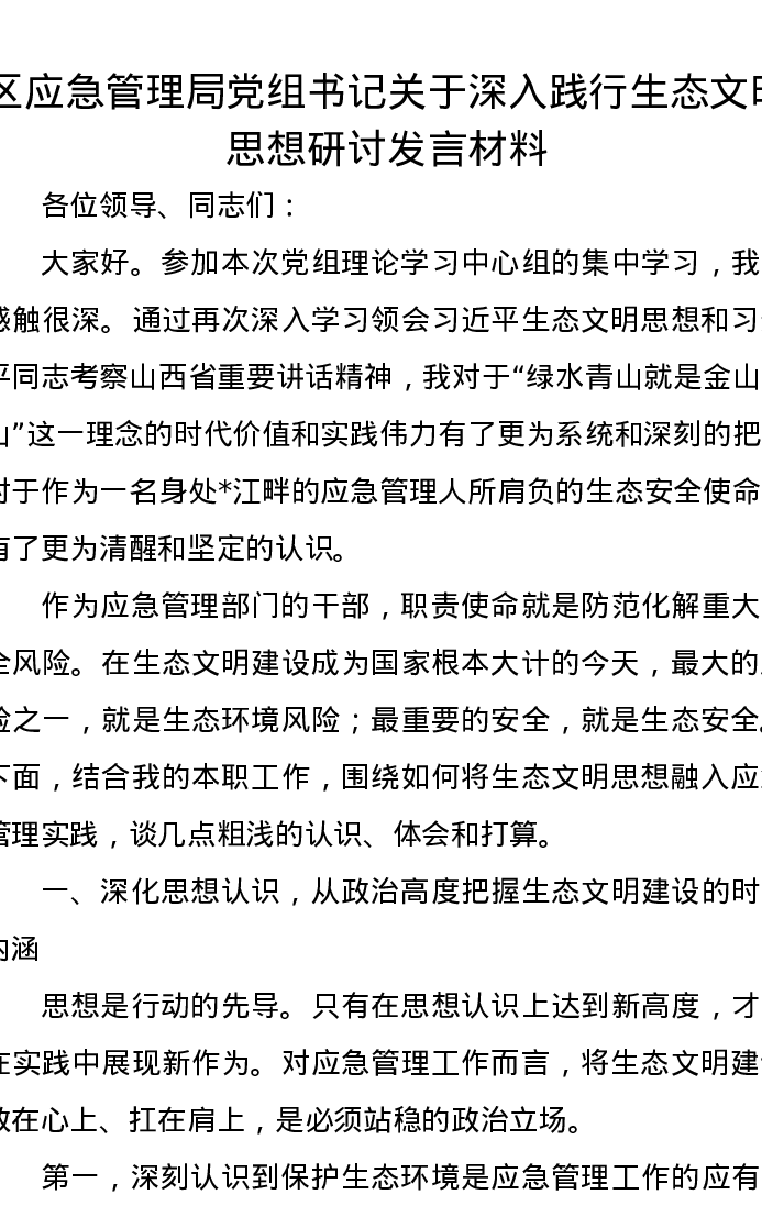 区应急管理局党组书记关于深入践行生态文明思想研讨发言材料
