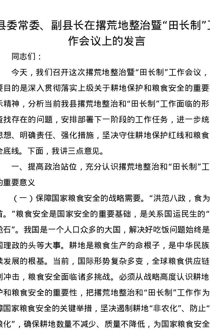县委常委、副县长在撂荒地整治暨“田长制”工作会议上的发言