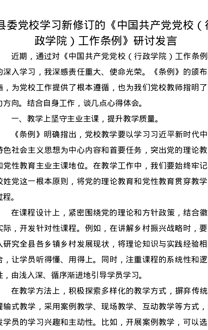 县委党校学习新修订的《中国共产党党校(行政学院)工作条例》研讨发言