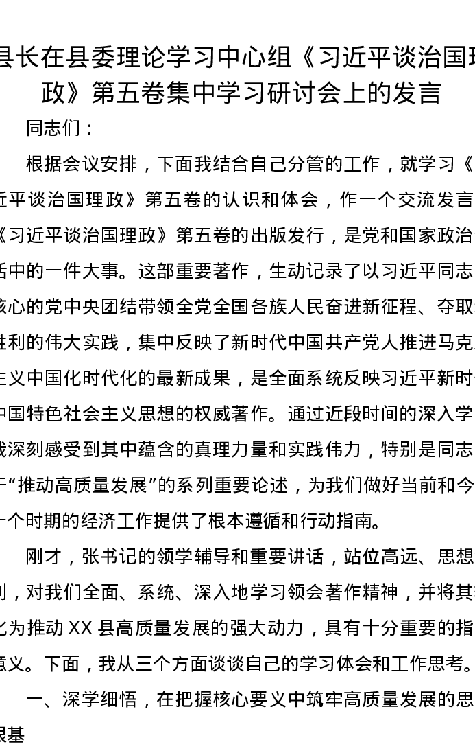 县长在县委理论学习中心组《习近平谈治国理政》第五卷集中学习研讨会上的发言