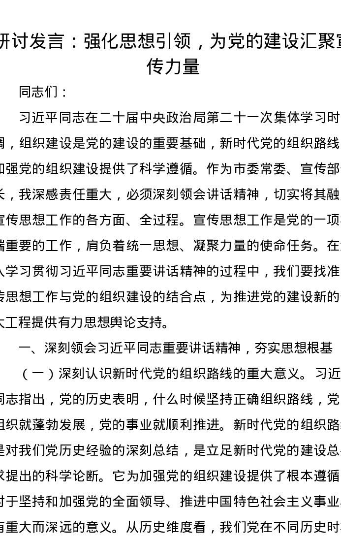 研讨发言:强化思想引领,为党的建设汇聚宣传力量