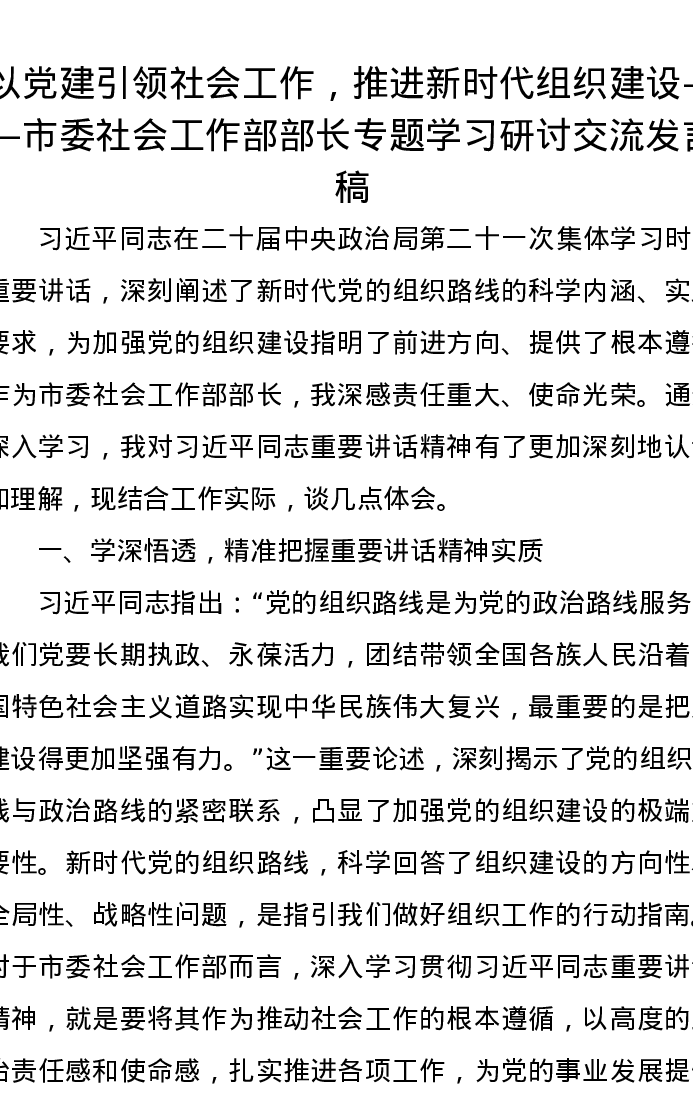 以党建引领社会工作,推进新时代组织建设——市委社会工作部部长专题学习研讨交流发言稿