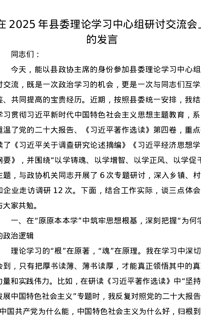 在2025年县委理论学习中心组研讨交流会上的发言