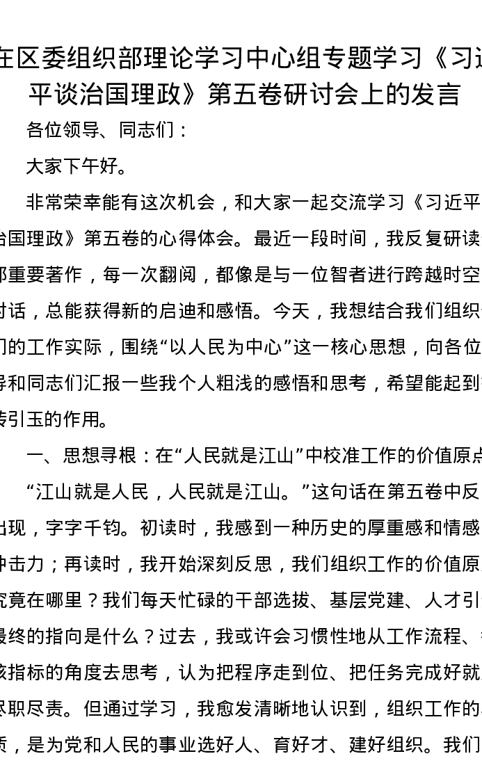 在区委组织部理论学习中心组专题学习《习近平谈治国理政》第五卷研讨会上的发言