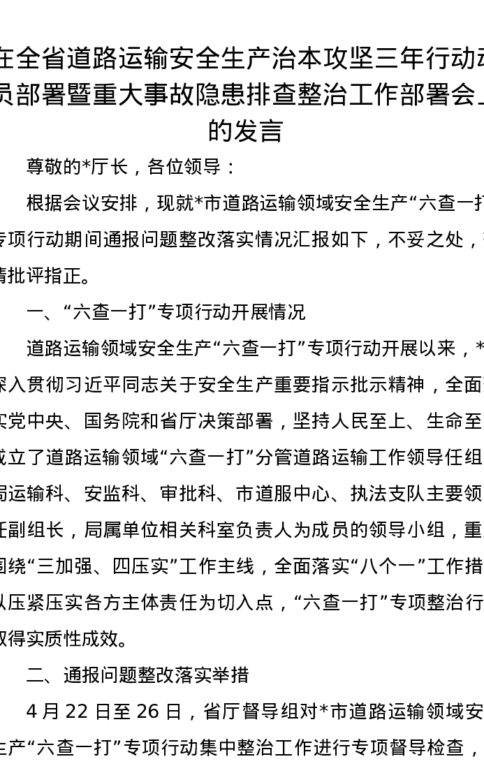 在全省道路运输安全生产治本攻坚三年行动动员部署暨重大事故隐患排查整治工作部署会上的发言