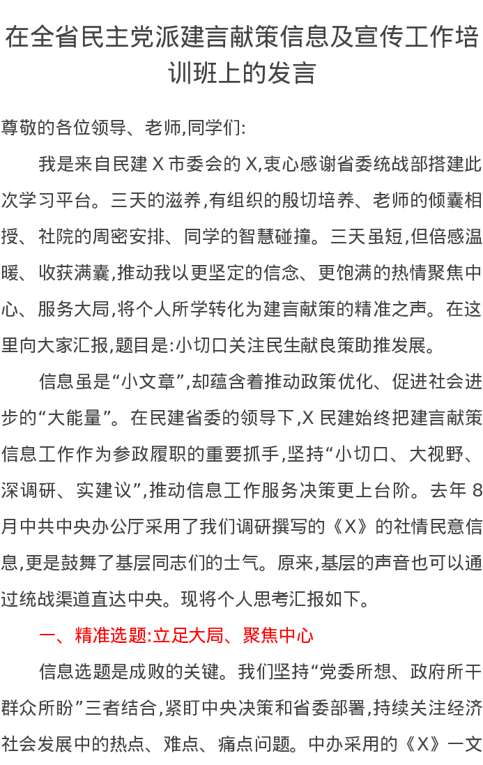 在全省民主党派建言献策信息及宣传工作培训班上的发言