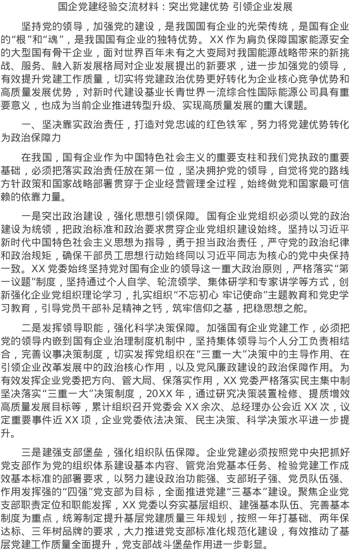 20220419国企党建经验交流材料:突出党建优势 引领企业发展