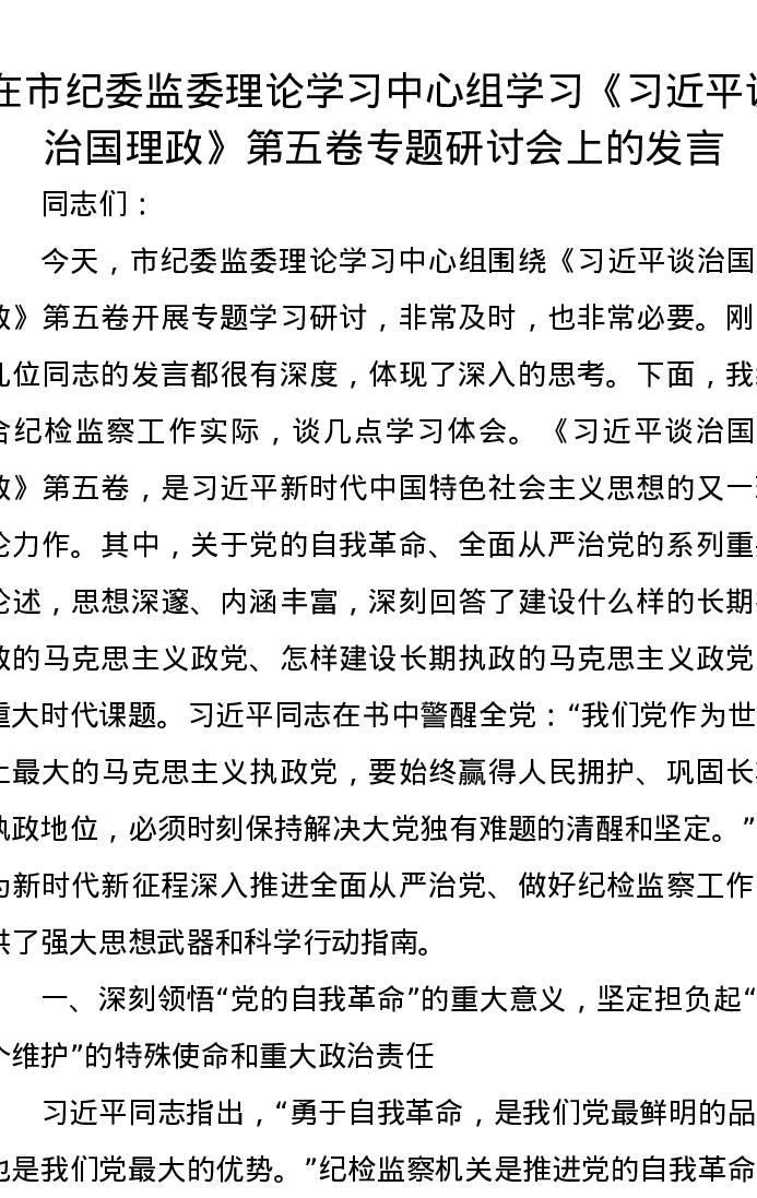 在市纪委监委理论学习中心组学习《习近平谈治国理政》第五卷专题研讨会上的发言