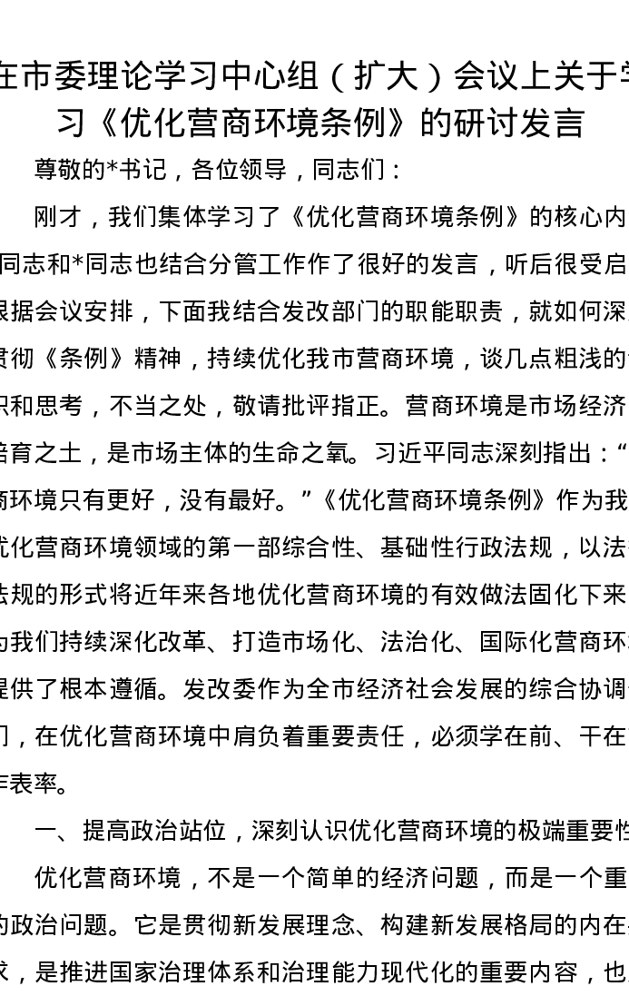 在市委理论学习中心组(扩大)会议上关于学习《优化营商环境条例》的研讨发言
