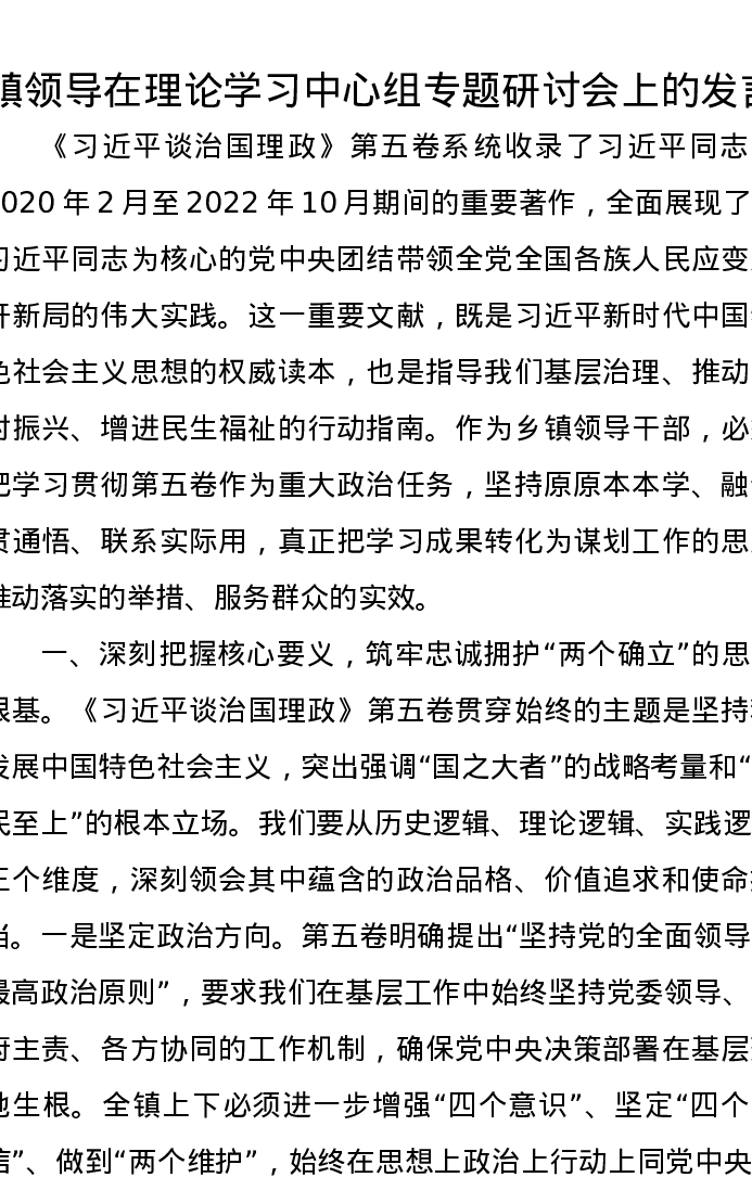 镇领导在理论学习中心组专题研讨会上的发言《习近平谈治国理政》第五卷