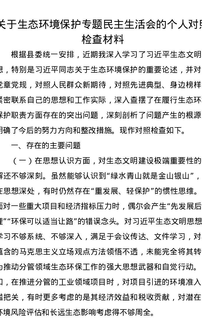 关于生态环境保护专题民主生活会的个人对照检查材料