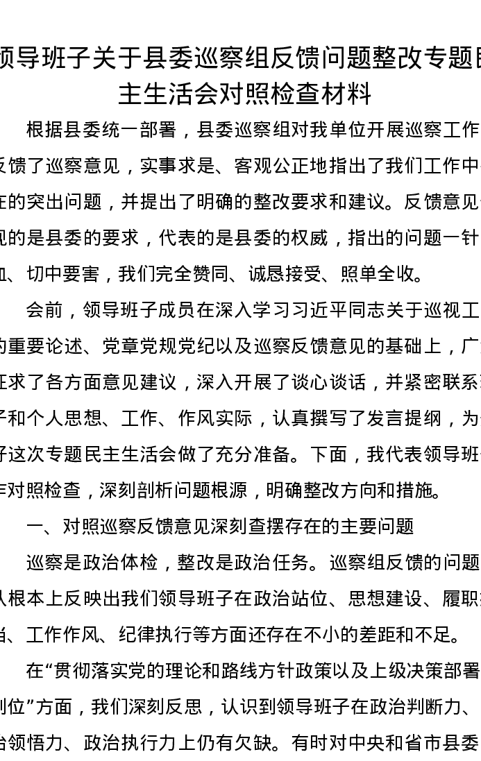 领导班子关于县委巡察组反馈问题整改专题民主生活会对照检查材料