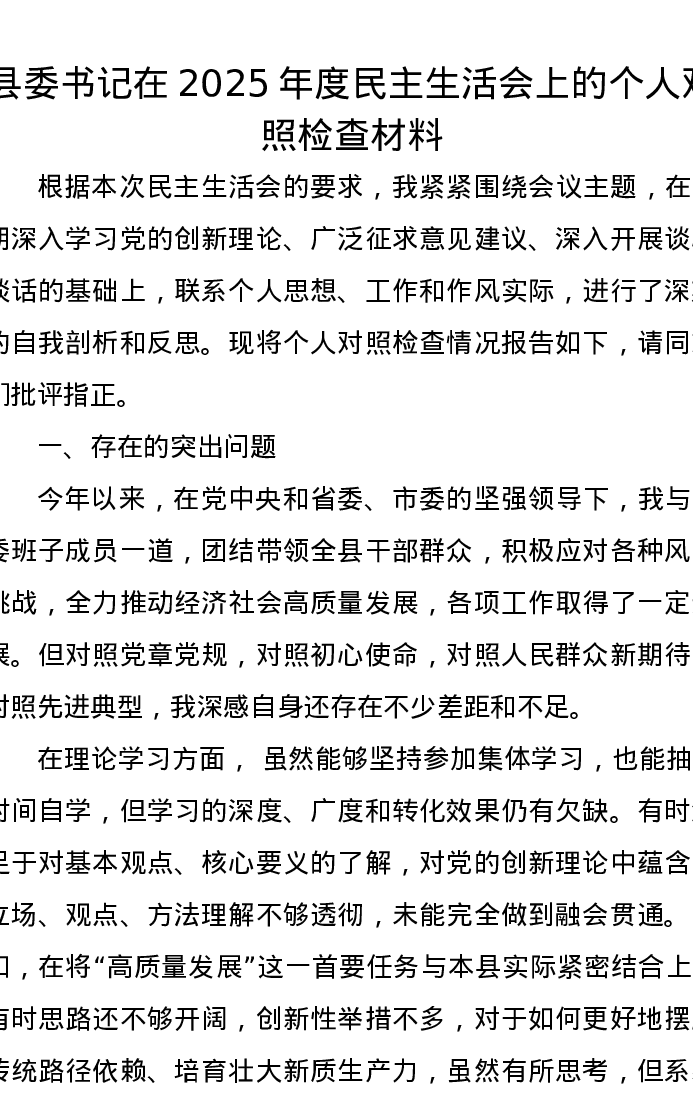 县委书记在2025年度民主生活会上的个人对照检查材料