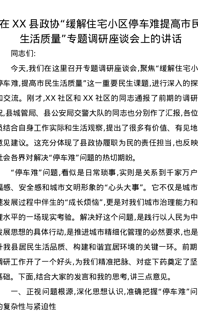 在XX县政协“缓解住宅小区停车难提高市民生活质量”专题调研座谈会上的讲话