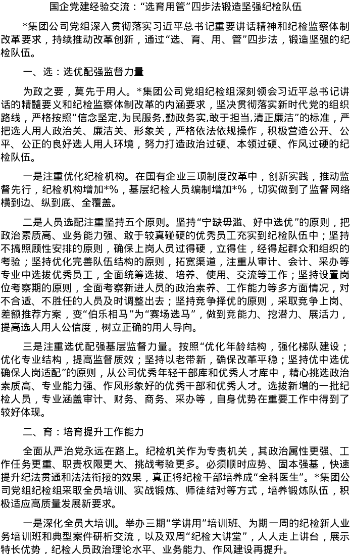 20220427国企党建经验交流:“选育用管”四步法锻造坚强纪检队伍