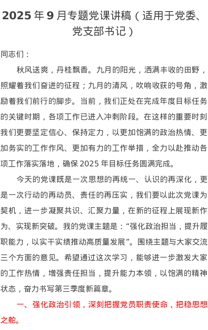 2025年9月专题党课讲稿(适用于党委、党支部书记)