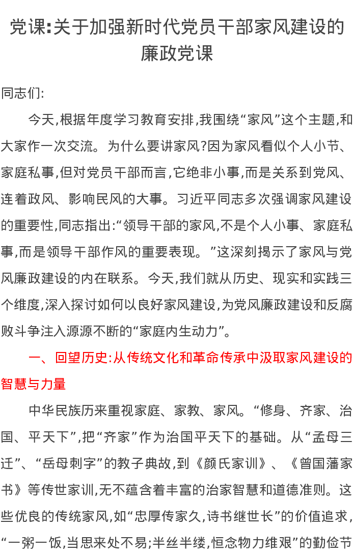 党课讲稿:关于加强新时代党员干部家风建设的廉政党课