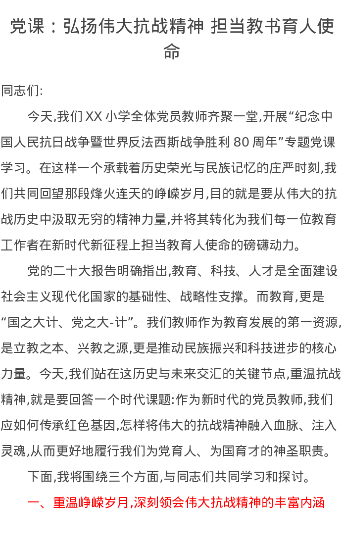 党课讲稿:弘扬伟大抗战精神 担当教书育人使命