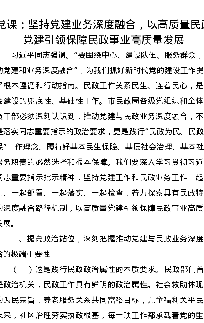 党课讲稿:坚持党建业务深度融合,以高质量民政党建引领保障民政事业高质量发展