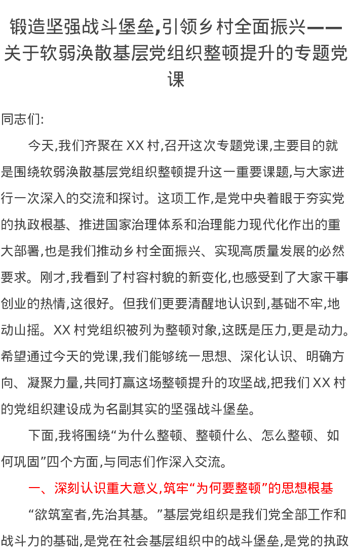 锻造坚强战斗堡垒,引领乡村全面振兴——关于软弱涣散基层党组织整顿提升的专题党课讲稿