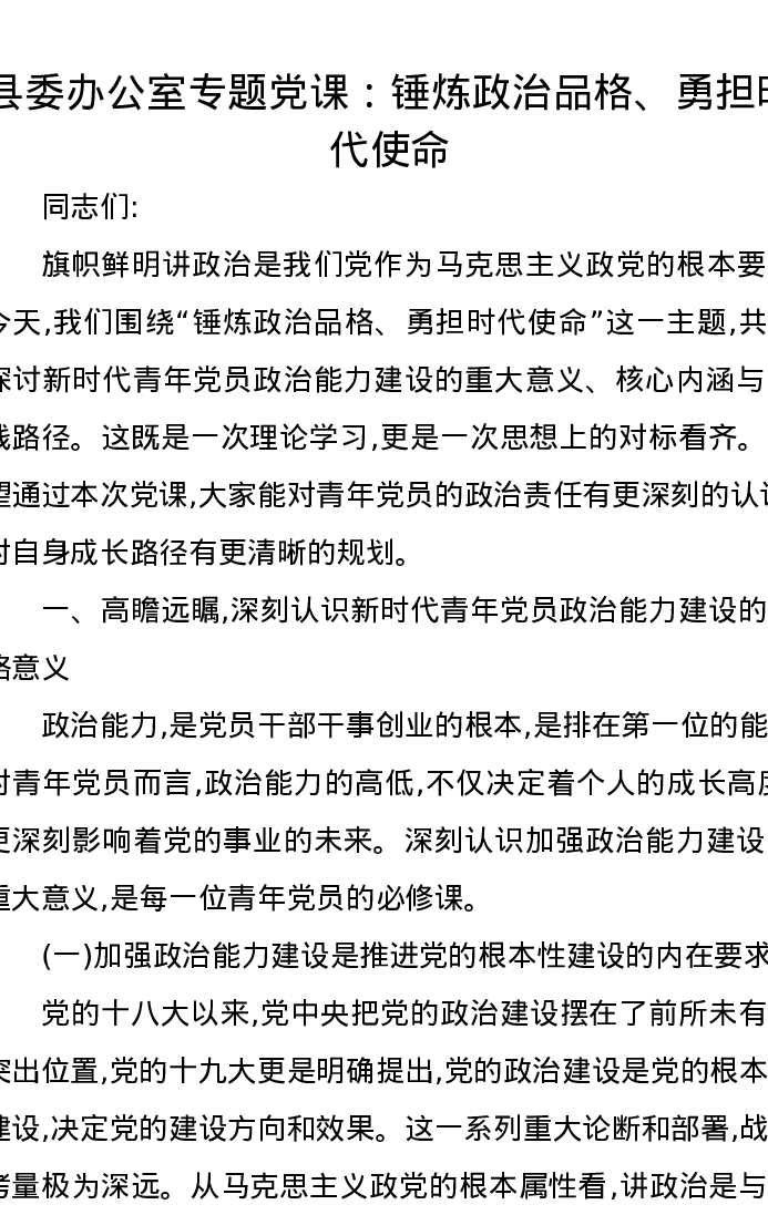县委办公室专题党课讲稿:锤炼政治品格、勇担时代使命