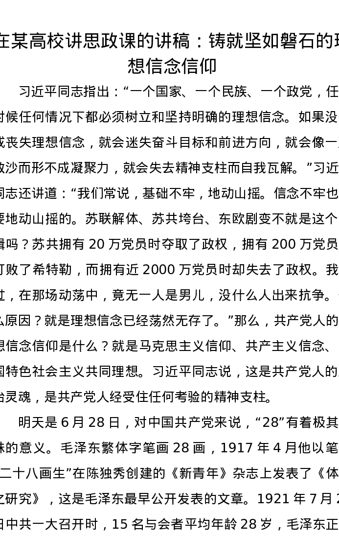 在某高校讲思政课的讲稿:铸就坚如磐石的理想信念信仰
