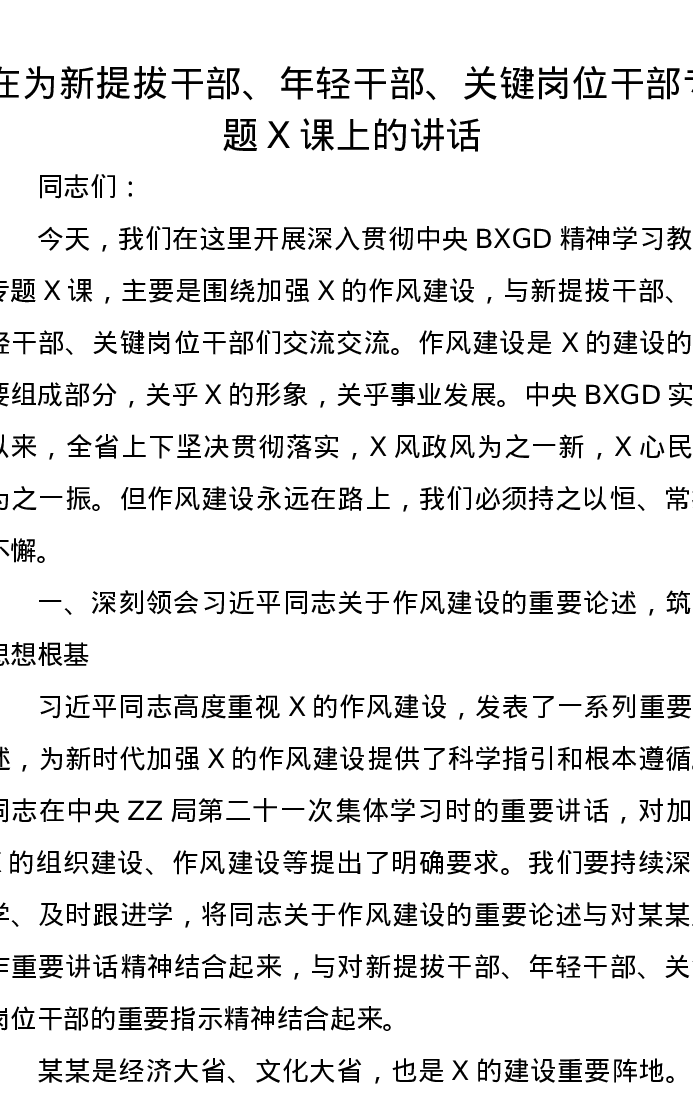 在为新提拔干部、年轻干部、关键岗位干部专题党课上的讲话