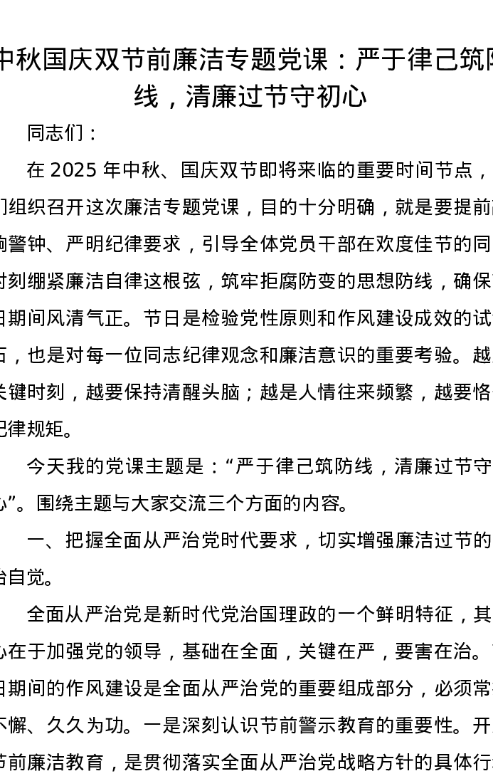 中秋国庆双节前廉洁专题党课讲稿:严于律己筑防线,清廉过节守初心