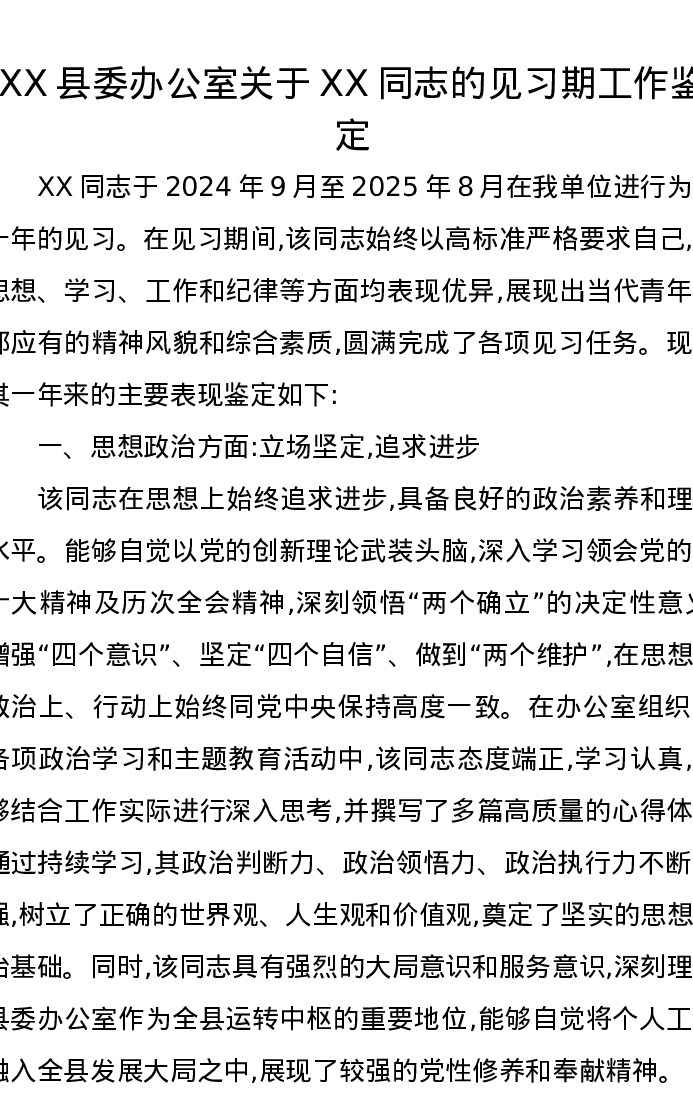 XX县委办公室关于XX同志的见习期工作鉴定