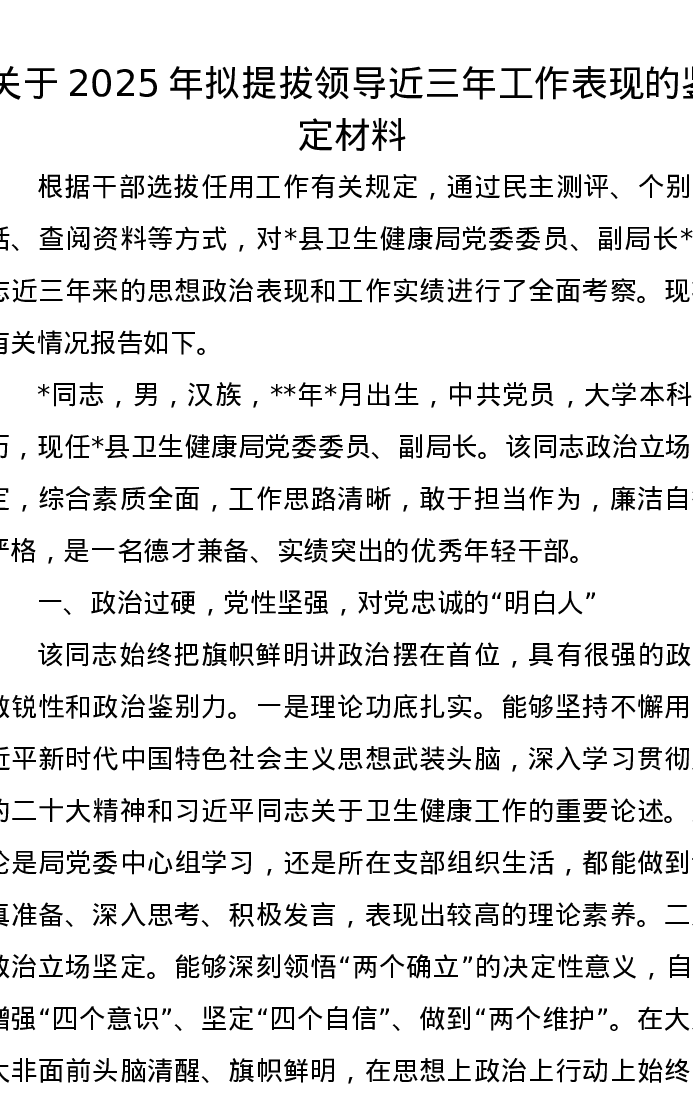 关于2025年拟提拔领导近三年工作表现的鉴定材料