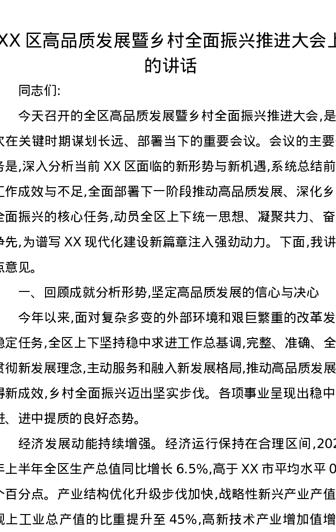 XX区高品质发展暨乡村全面振兴推进大会上的讲话