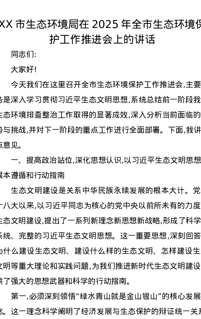 XX市生态环境局在2025年全市生态环境保护工作推进会上的讲话
