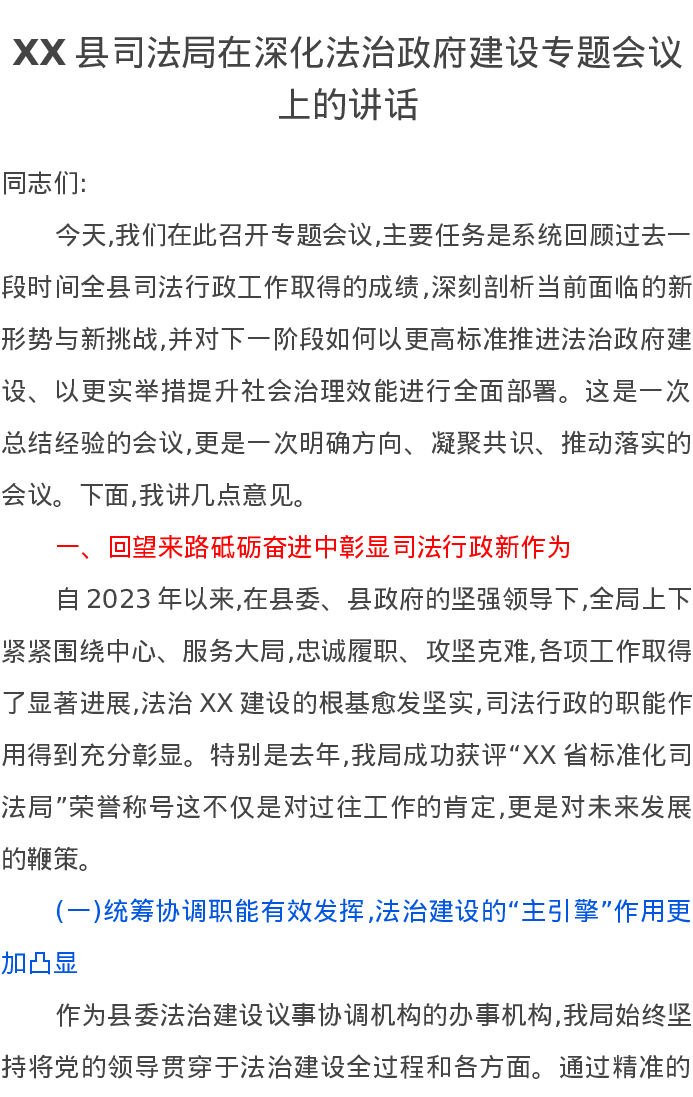 XX县司法局在深化法治政府建设专题会议上的讲话