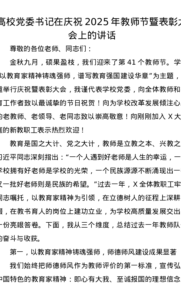 高校党委书记在庆祝2025年教师节暨表彰大会上的讲话