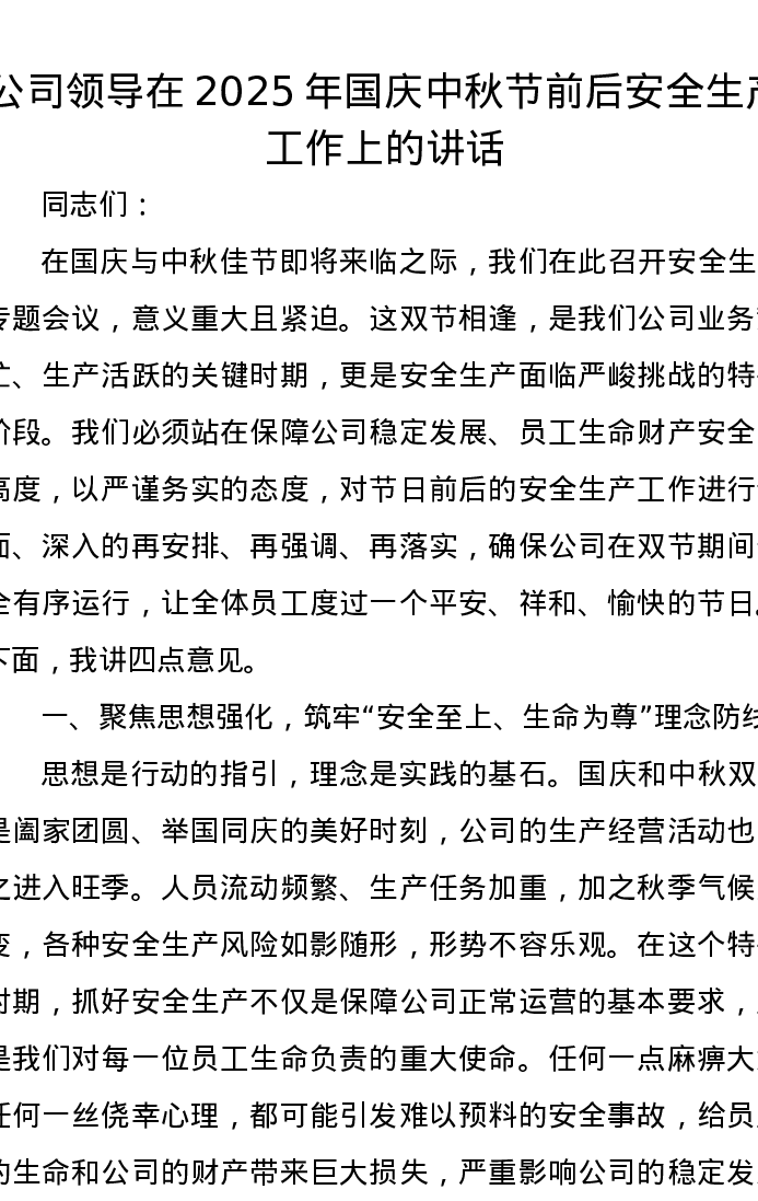 公司领导在2025年国庆中秋节前后安全生产工作上的讲话
