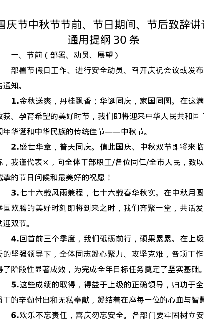 国庆节中秋节节前、节日期间、节后致辞讲话通用提纲30条