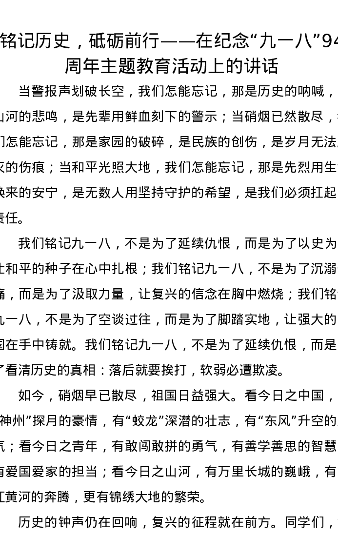 铭记历史,砥砺前行——在纪念“九一八”94周年主题教育活动上的讲话
