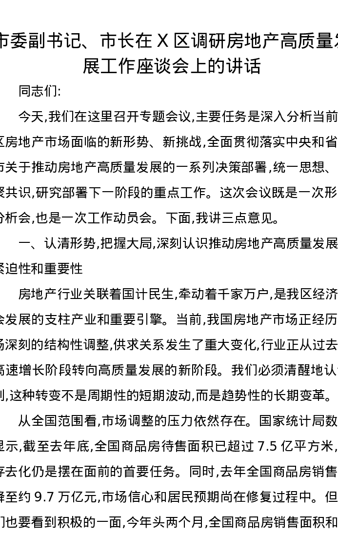 市委副书记、市长在X区调研房地产高质量发展工作座谈会上的讲话