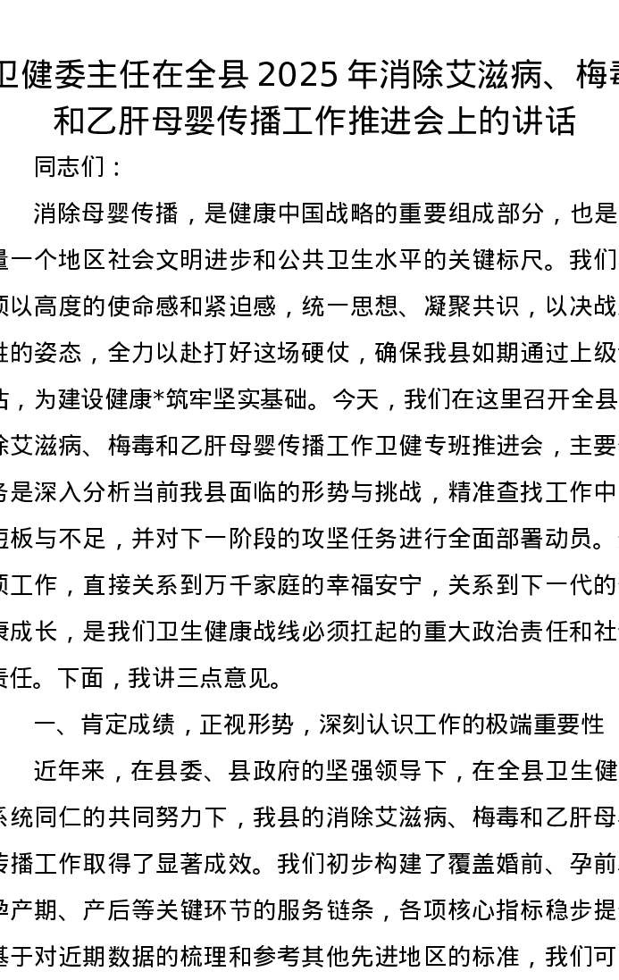 卫健委主任在全县2025年消除艾滋病、梅毒和乙肝母婴传播工作推进会上的讲话