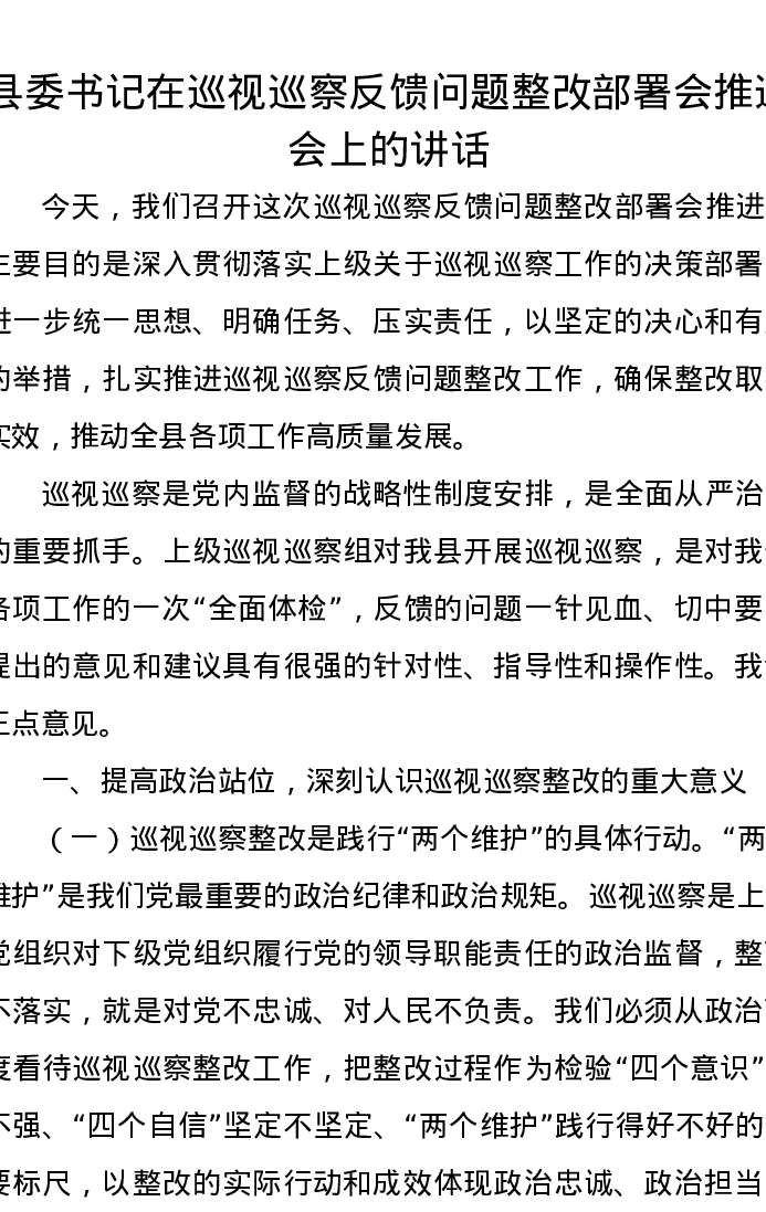县委书记在巡视巡察反馈问题整改部署会推进会上的讲话